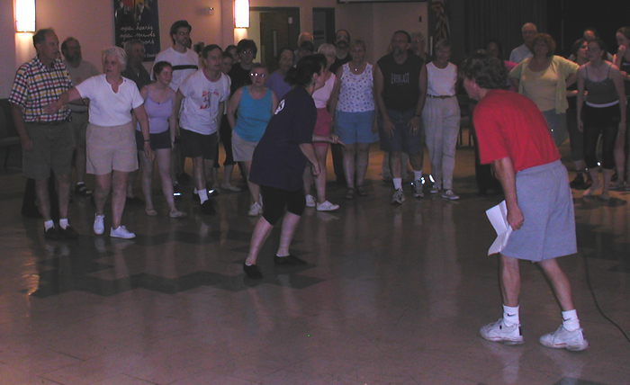 | Another fine example of poor lighting and an idiot using the camera. Still, you can see Cindy singing "My Mother's Wedding Day" as Joe yells instructions to the chorus. (The chorus is a group of wonderful people, but getting them to actually interact with what's going on around them is almost as hard as getting me to look like something other than a massive piece of lumber wandering aimlessly around the stage.) |