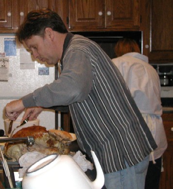 Thanksgiving Day, and Dad's a carvin' the turkey. We don't know who bought him that shirt, but he or she should be in prison.